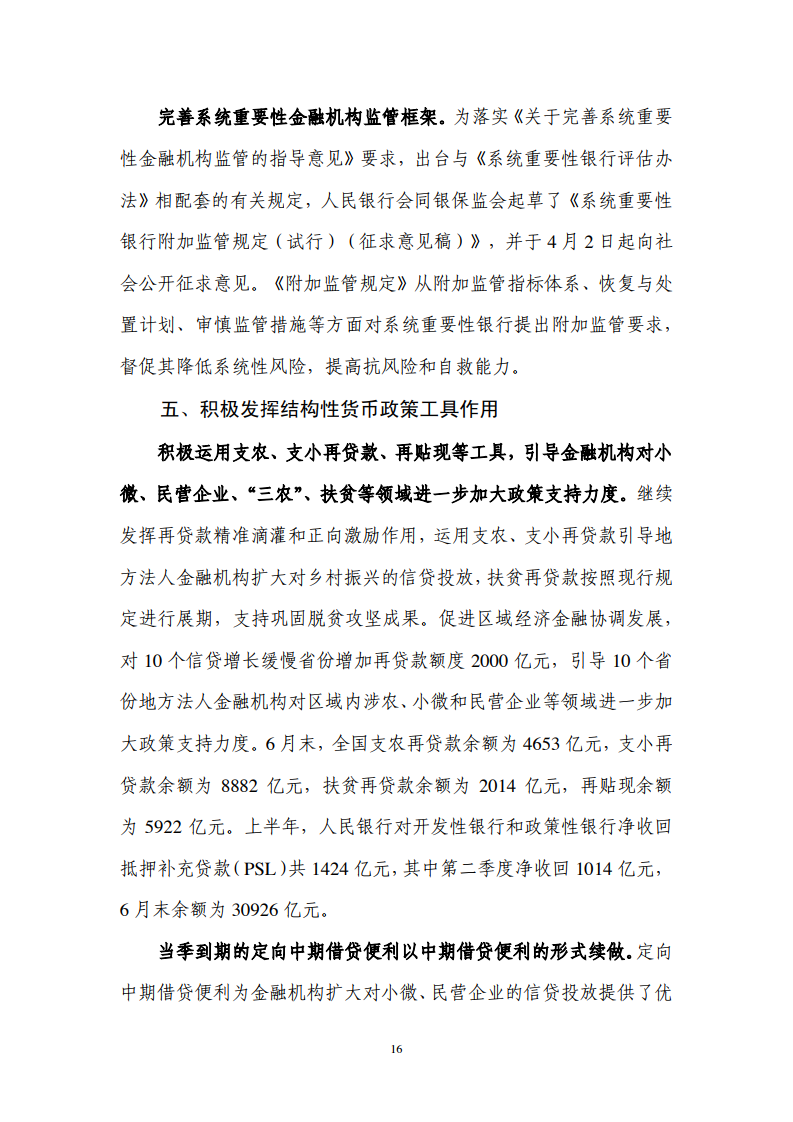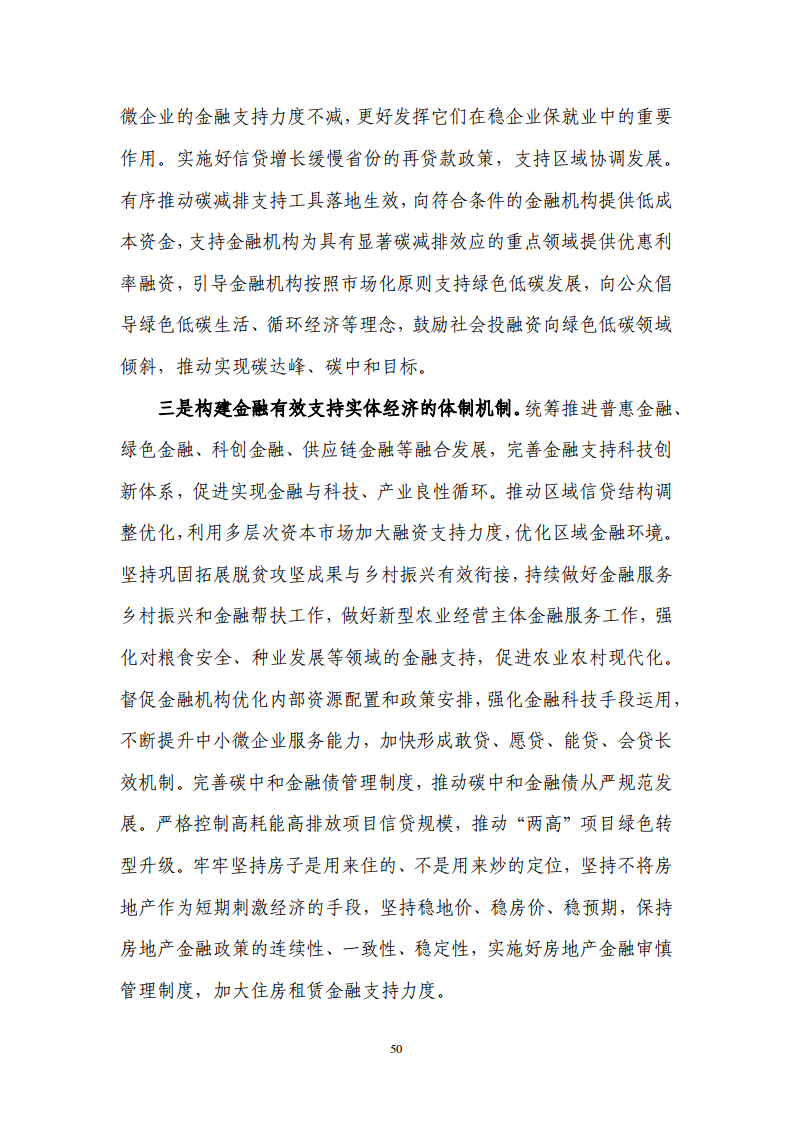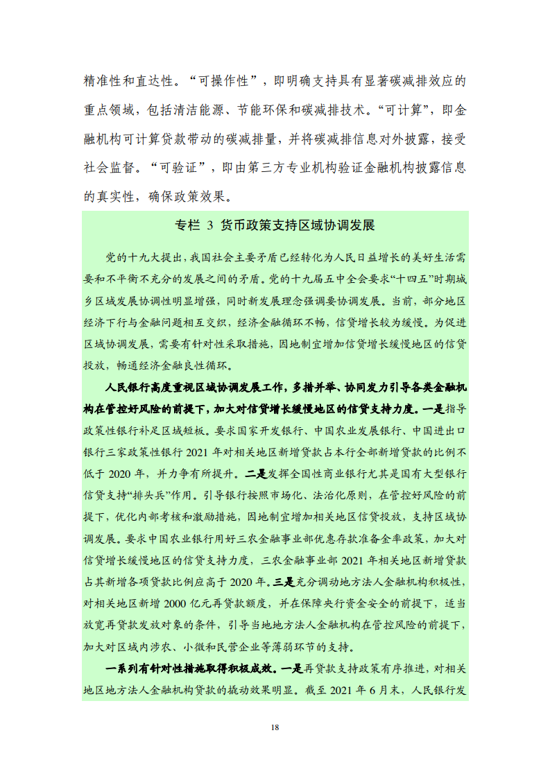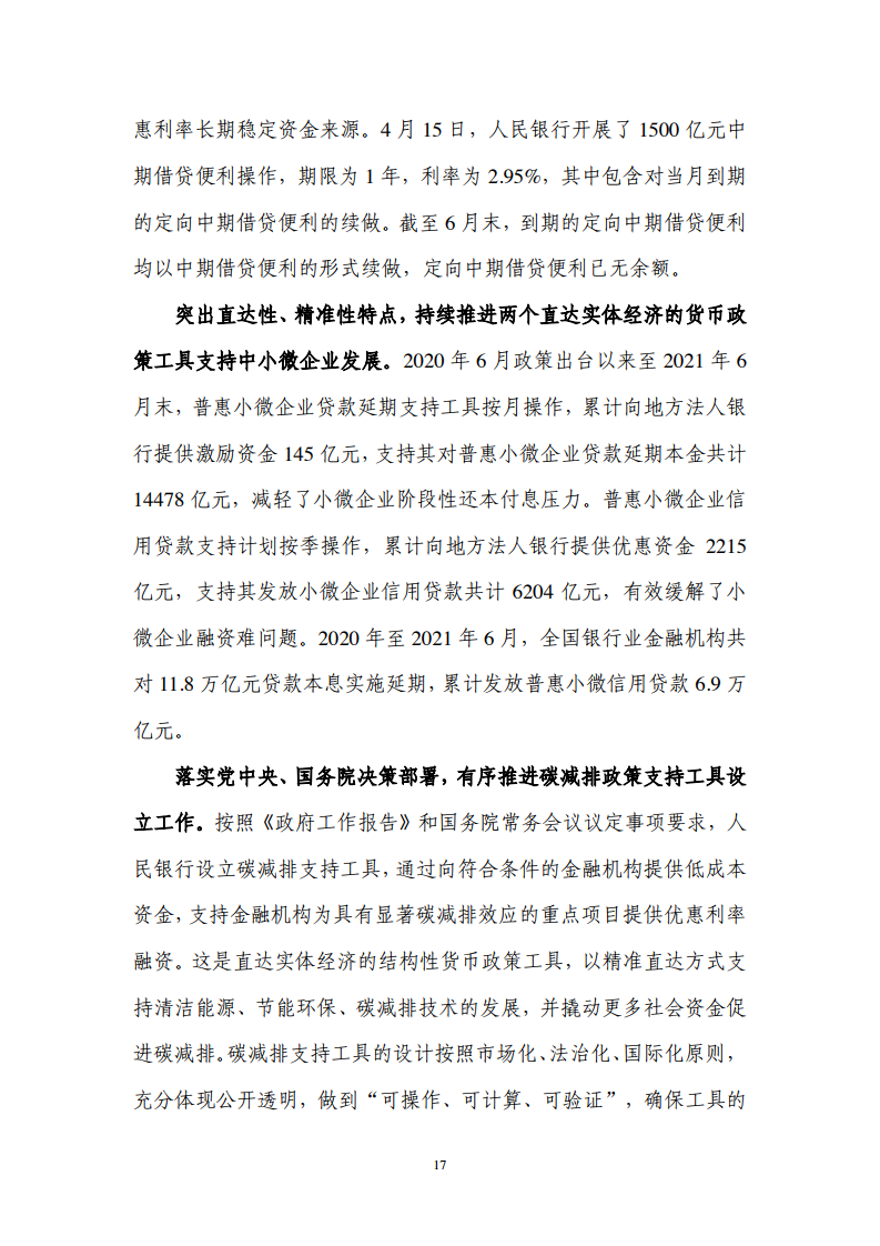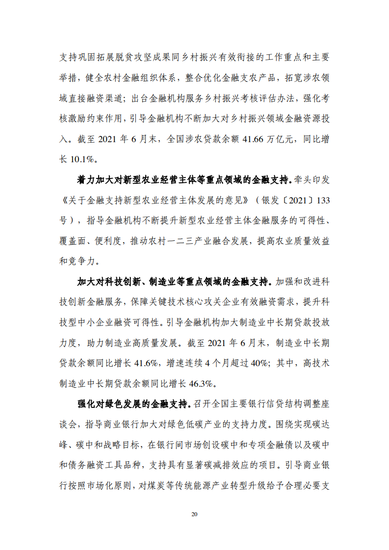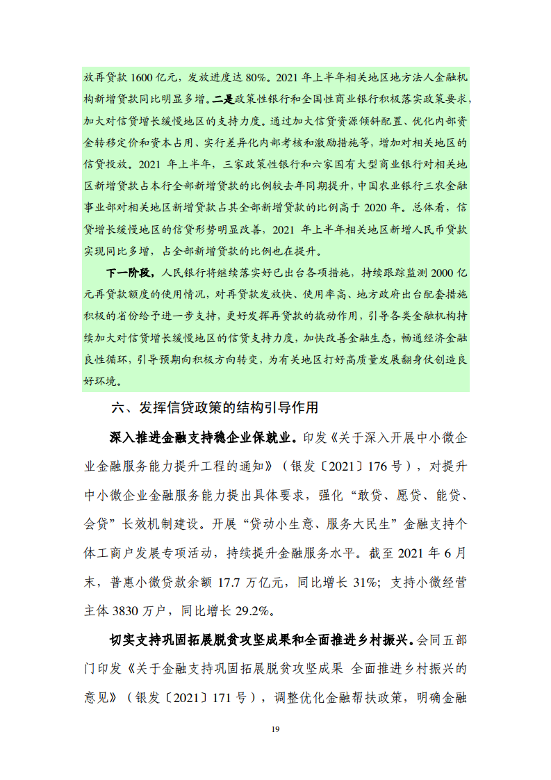 二 是发挥好结构性货币政策工具牵引带动作用。实施好两项直达实体经 济货币政策工具的延期工作,通过对信贷增长缓慢省份增加再贷款等 综合措施支持区域协调发展,对科技创新、小微企业、绿色发展、制 造业等需要长期支持的领域加大政策支持力度。