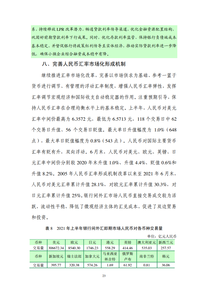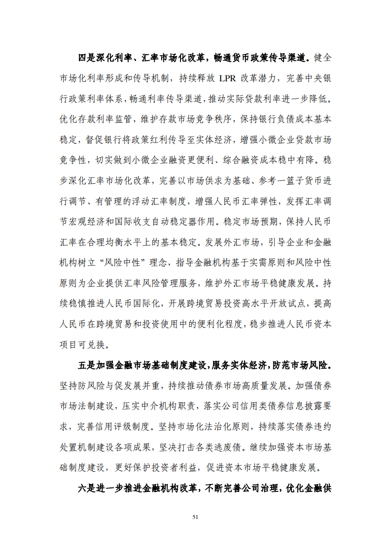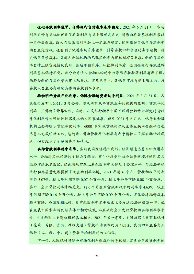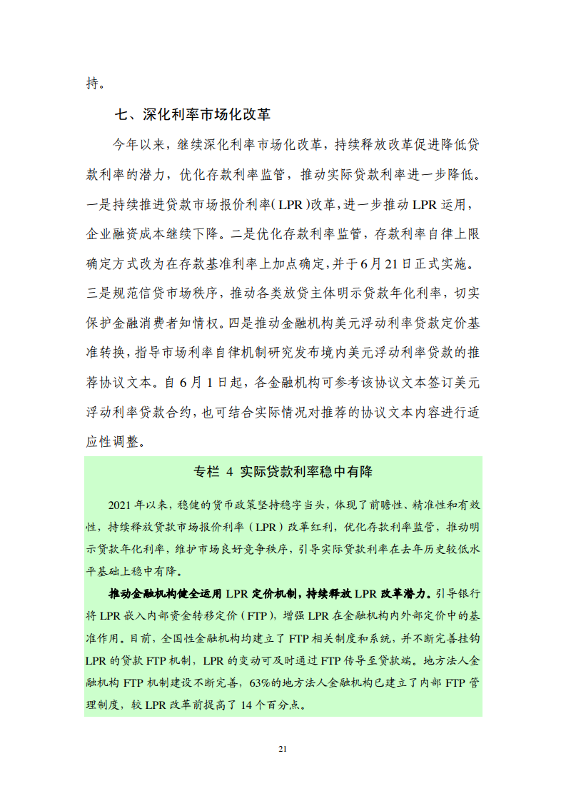 三是持续释放贷款市 场报价利率改革促进降低贷款利率的潜力。进一步推动贷款市场报价 利率(LPR)运用,优化存款利率监管,调整存款利率自律上限确定 II 方式,促进社会综合融资成本稳中有降。