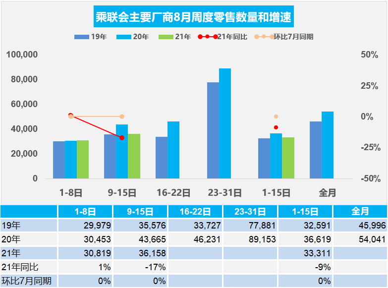 部分车企的高温假集中在8月上旬,生产部门在芯片不足的情况下集中休假。8月初的厂商产销相对平淡, 高温假休假因素导致批发偏低,因此批发表现相对稍低。