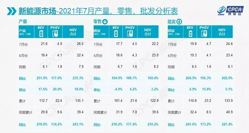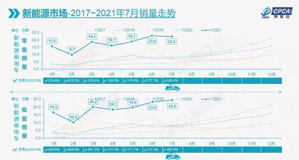 7 月,国内新能源乘用车零售量相较去年同期增长了 169.4%,达到 22.2 万辆,环比微降 3.2%。其中当月纯电动汽车零售量为 17.7 万辆,环比下降 4.9%,同比增长 164.9%;插电混动零售量为 4.5 万辆,环比下降 4.2%,同比增长 188.7%。