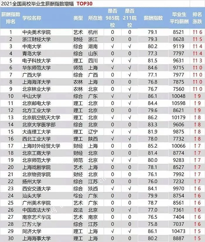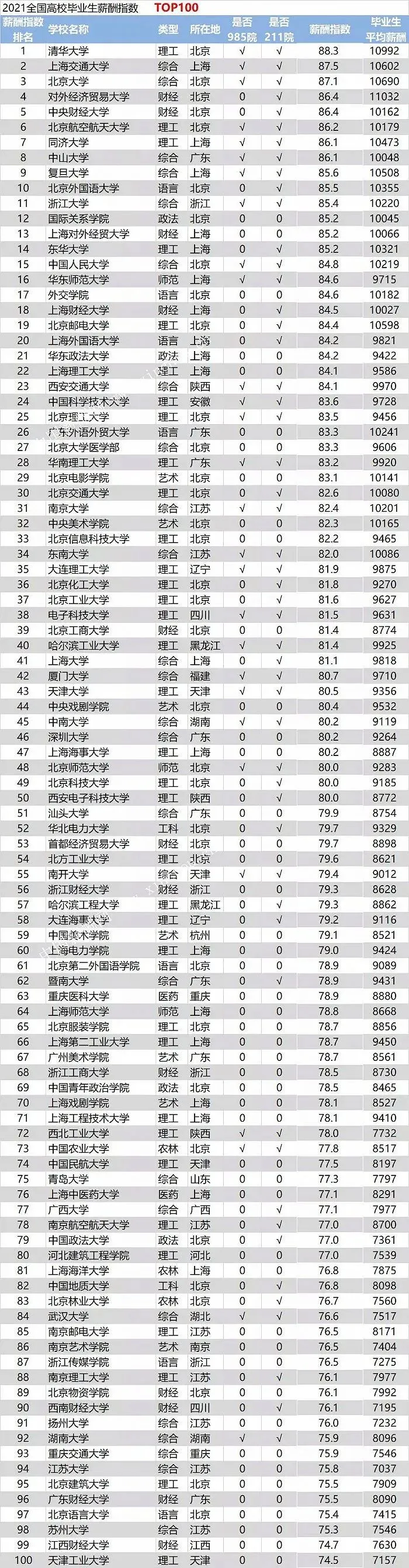 2021全国高校毕业生薪酬指数排行榜前一百位