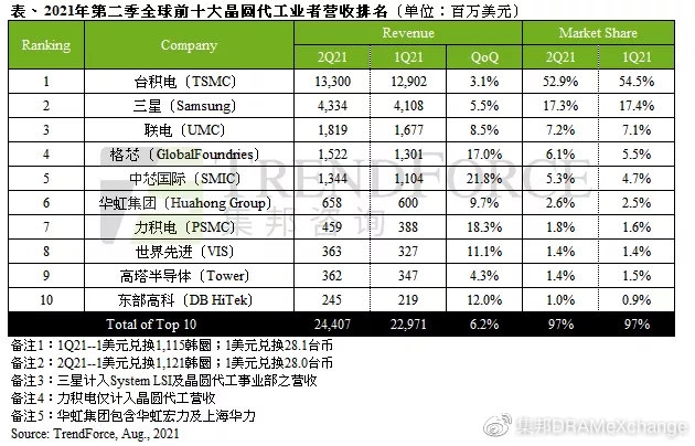 不过台积电4月份遭遇南科Fab14 P7工厂跳电事故,5月份遭遇兴达电厂跳电,导致产能部分受影响,而且保价比较保守,因此增幅略低于其他厂商,市场份额从Q1季度的54.5%下滑到了52.9%。