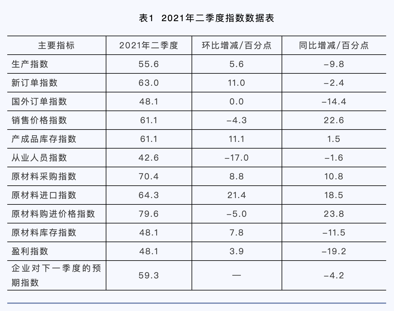 2021年二季度生产指数高于临界点,为55.6,较一季度上升5.6个百分点,比去年同期下降9.8个百分点。