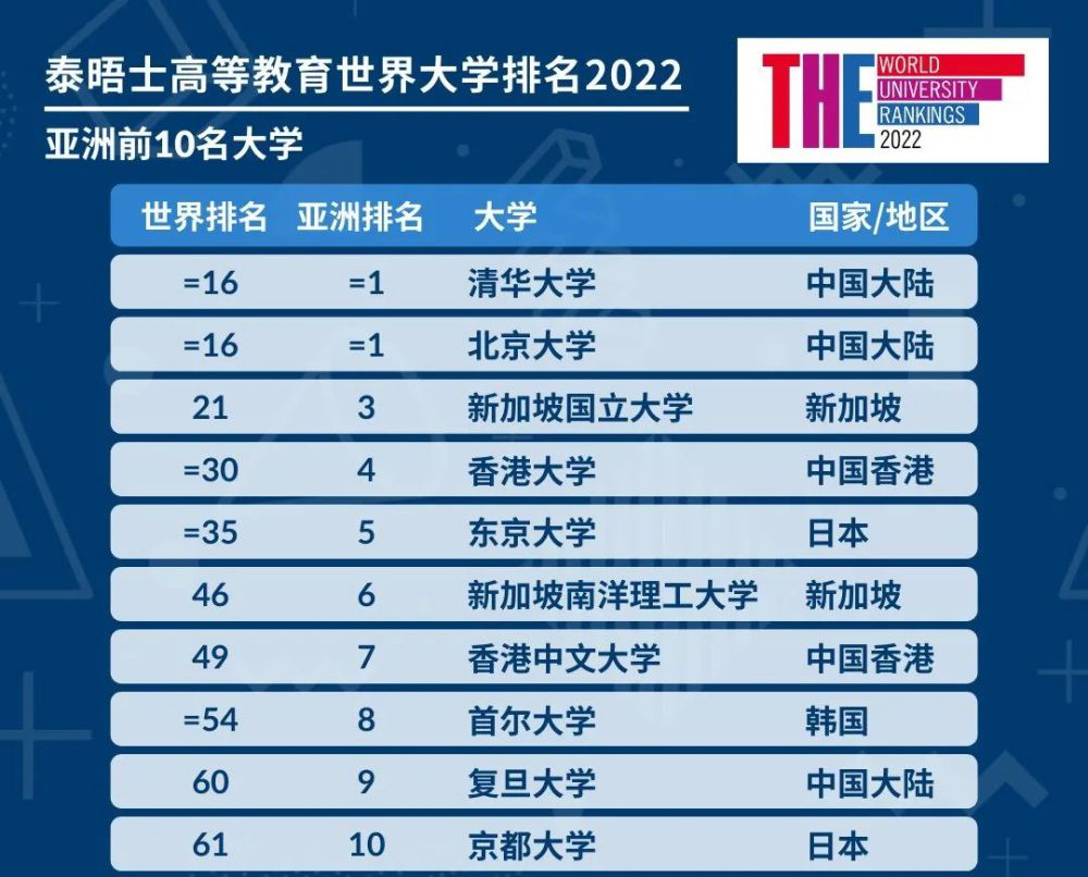 当地时间2日,泰晤士高等教育特刊(Times Higher Education,简称THE)更新了最新2022年THE世界大学排名。榜单结果显示,清华大学和北京大学并列排名第16位,并列亚洲地区高校第一。这也是中国大陆高校在该排行榜上有史以来的最高排名。