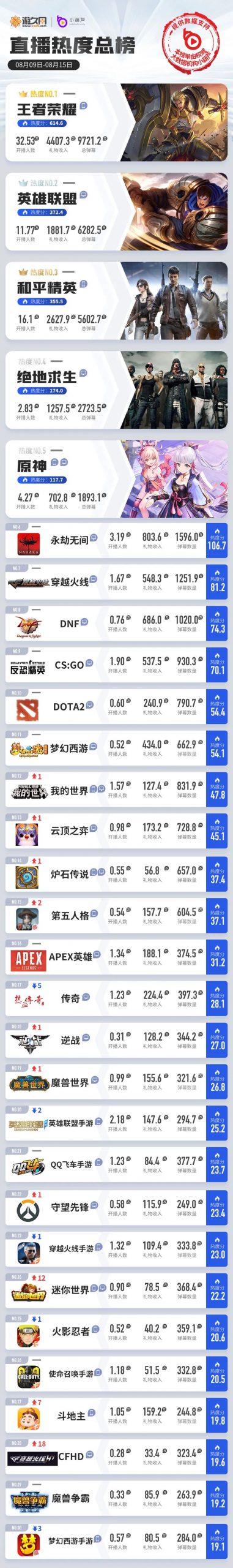 本周(8月09日-8月15日)全网游戏直播数据中,头部游戏像《王者荣耀》《和平精英》《原神》等,排名虽未改变但数据成功回暖。经历了上周的礼物数跳水,本周中下游的游戏直播数据也整体上涨,排名大多有小幅回升,《斗地主》《CFHD》也趁此机会重新上榜。更多详细数据请见直播热度总榜。