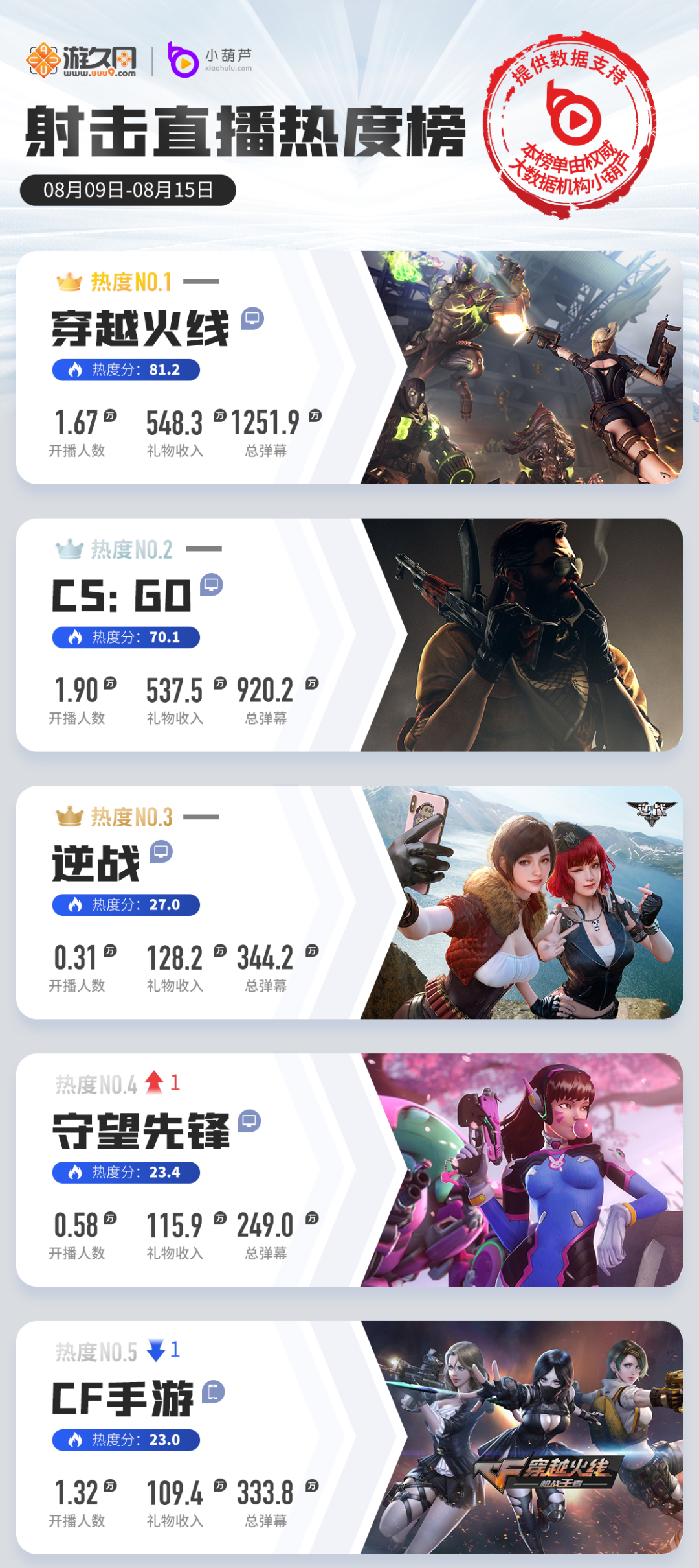在射击游戏榜单中,本周整体数据对比上周有所回暖,位列第2的《CS:GO》在礼物收入上出现了65%的提升,但是仍然不敌在拥有庞大基数的同时本周礼物收入上升26%的《穿越火线》。《逆战》在“九周年回流福利”的热度发酵之下,依然保持了数据上涨。