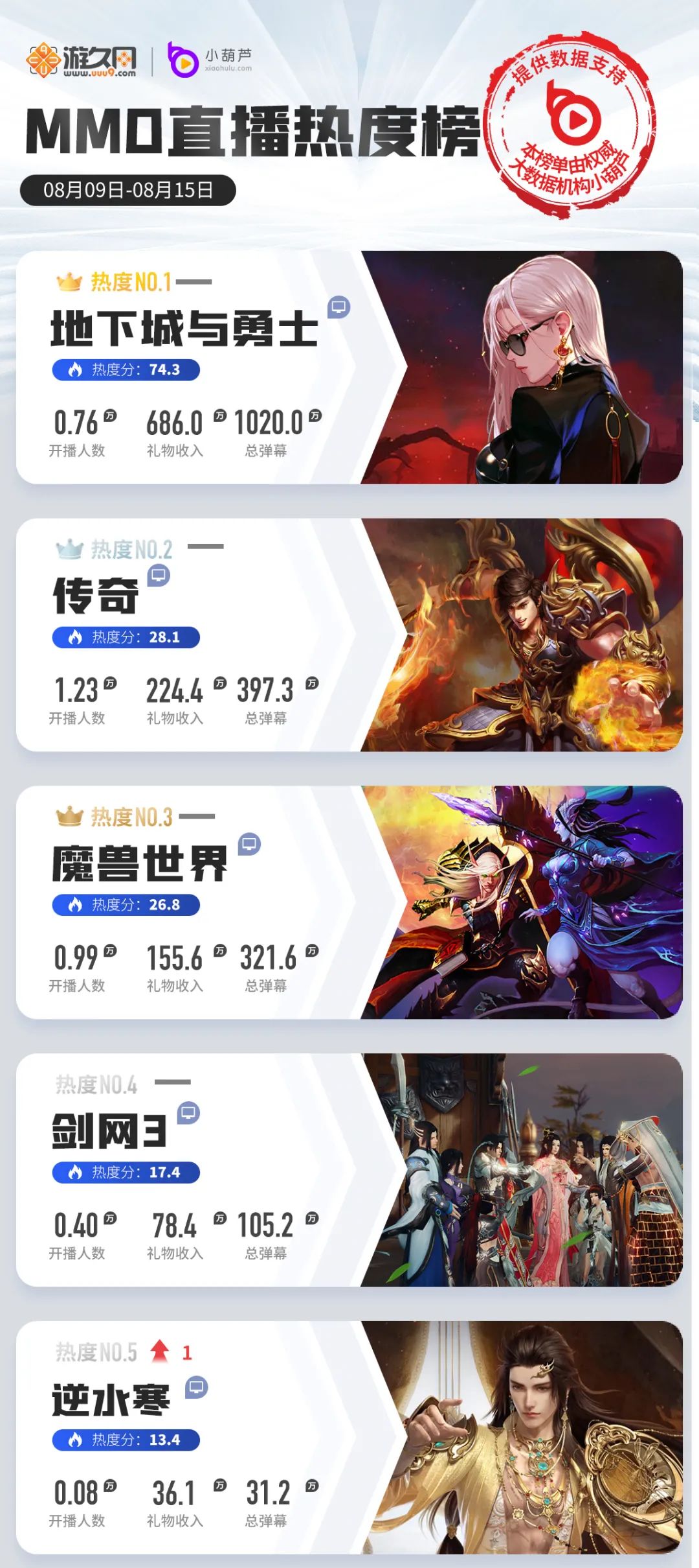 排名第2的《传奇》本周礼物量再次腰斩,落到二百多万,不过观众活跃度仍在,稳住了排名。《魔兽世界》虽然排名没有变化,但受到“导师招募”活动以及“统御圣所”随机团队副本新区解锁的影响,本周直播数据有明显增长。