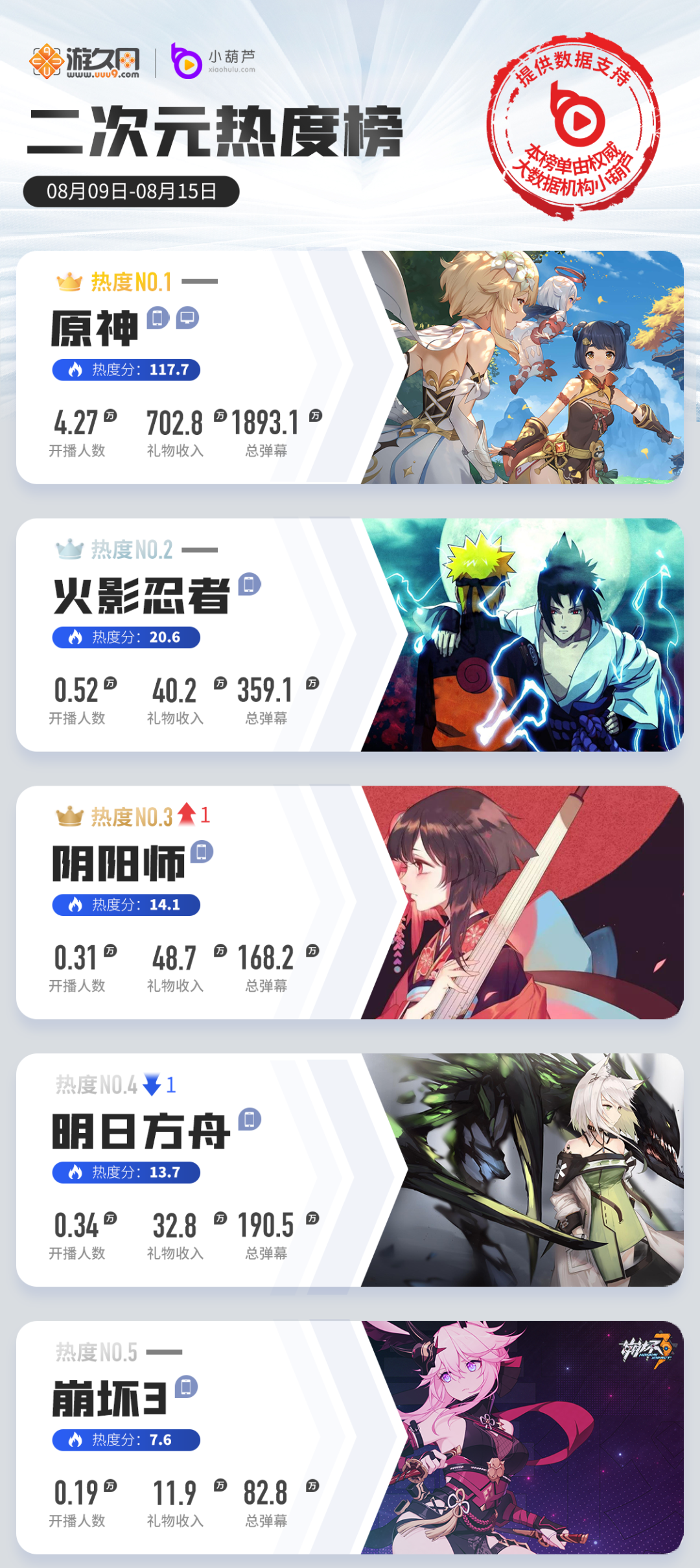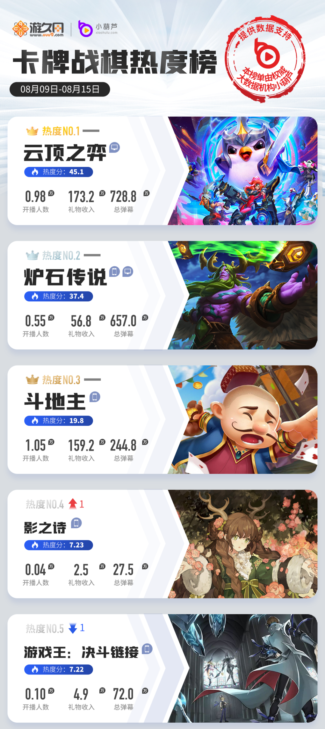本周前3位仍然稳固着自己的直播平台和数据,而多次交手的《影之诗》和《游戏王:决斗链接》在本周再次易位,不过由于两者的得分十分接近,鹿死谁手尚且需要接下来几周的持续关注。