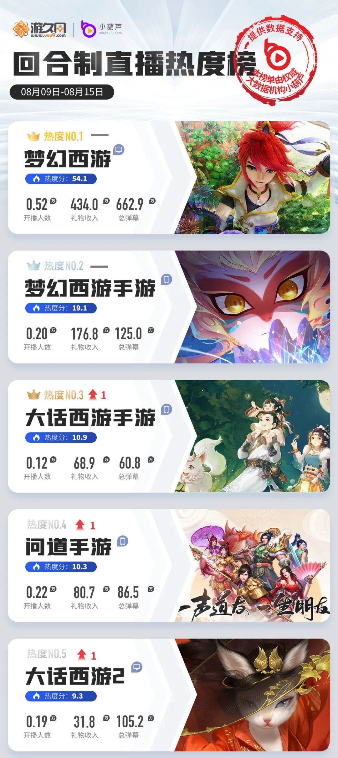 本周排名没有相对变化,但《梦幻西游》双端的数据再次出现大步增长。迎来七夕节日的一周,《梦幻西游》开启了七夕锦衣祥瑞专题,多重主题活动,玩家热度高涨。同时《梦幻西游》手游的x9联赛进入了决赛阶段,多个合作平台进行直播,助力总体数据的增幅。
