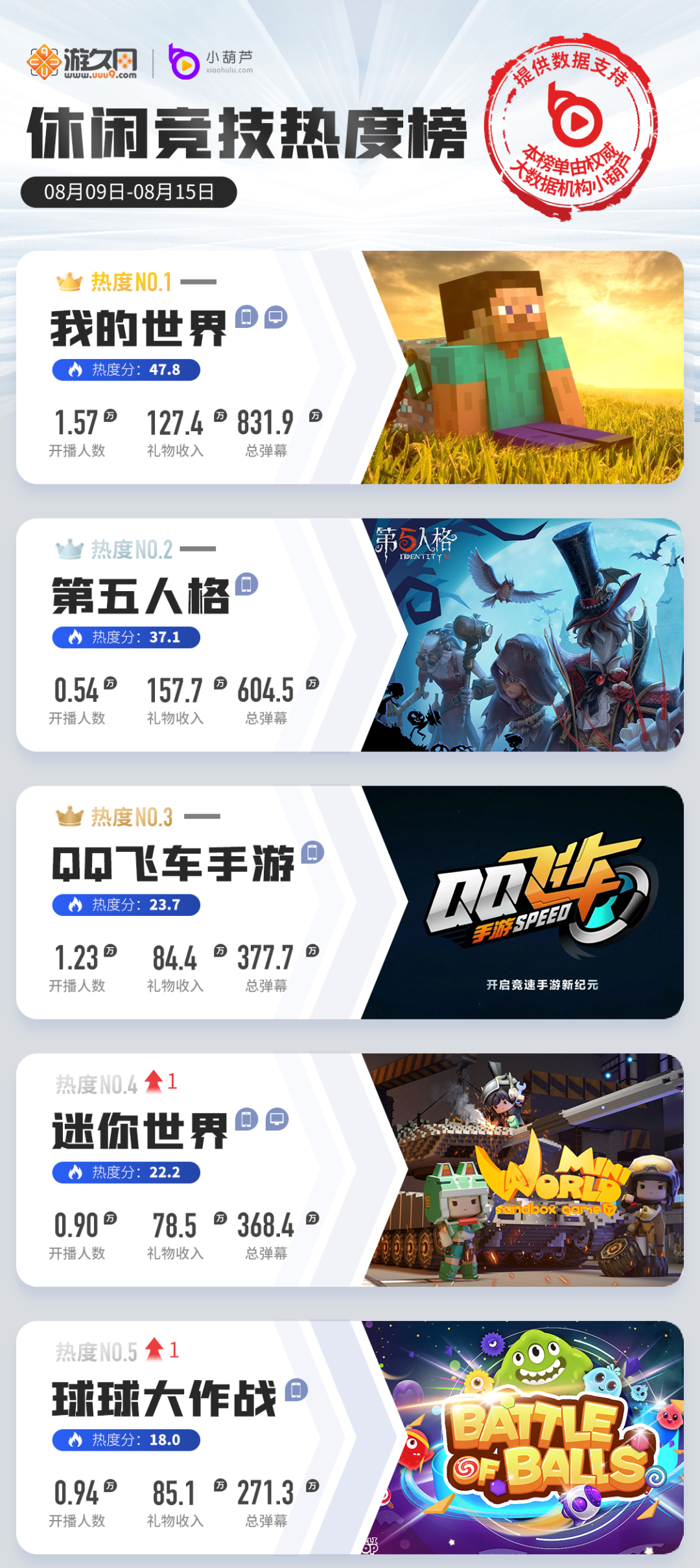 上周同样受到礼物下降影响的《迷你世界》,新上线的生日派对活动,为游戏热度添了一把柴,又因为在8月15日迎来“全民建造节”的作品投稿截止日,玩家们在本周加班加点的赶工,也助力了《迷你世界》本周直播数据全线上涨,最终前进了12位,来到总榜第24名。