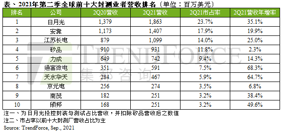 江苏长电(JCET)及天水华天(Hua Tian),为应对国内5G通讯及基站、消费性电子及车用等终端需求加大产线供给,推升两家业者第二季营收分别达11.0与4.7亿美元,年增率25%、64.7%。值得一提的是,除了受上述终端需求带动,通富微电以68.3%的年增率作为第二季前十大业者中成长最多的企业,营收达5.9亿美元。主因是通富微电为AMD处理器芯片主要封测代工厂,在AMD拿下Intel部分市占的情况下,该企业营收因此受惠。