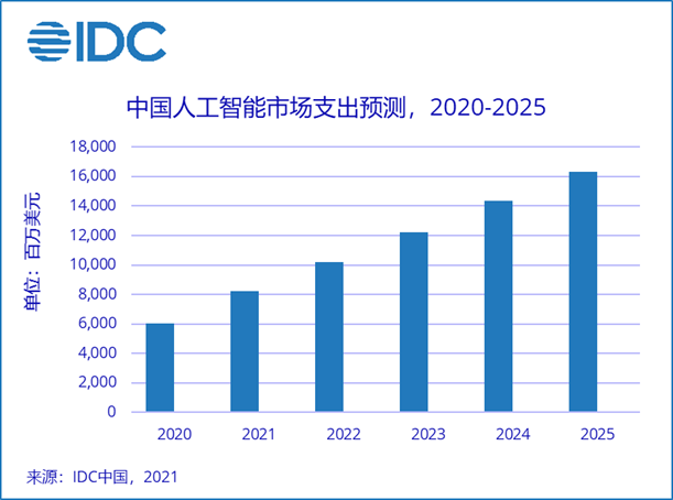 IDC预测,全球AI市场支出将在2021年达到850亿美元,并在2025年增至2,000亿美元,五年复合增长率(CAGR)约为24.5%。2025年,全球约8%的AI相关支出将来自于中国市场,市场规模在全球九个区域中位列第三。