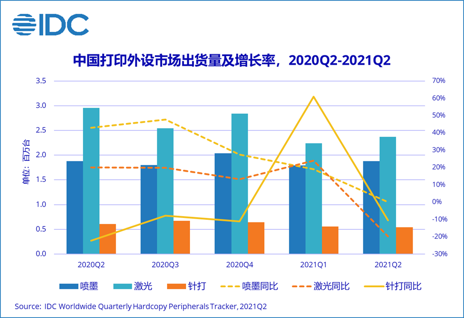 造成二季度市场下滑的原因有几方面:首先,供应短缺问题愈演愈烈,各品类打印设备都有不同程度的短缺,其中激光打印设备的短缺最为严重。二季度东南亚国家疫情再次升级,部分厂商在当地的工厂生产受到严重影响,造成中国国内产品供应严重短缺;其次,原材料价格上涨及海运成本上升带来企业经营成本压力增大,打印设备厂商纷纷上调产品价格,一定程度上抑制了部分用户的采购需求;此外,近期政策调整等原因造成家庭及教培行业采购需求下降。