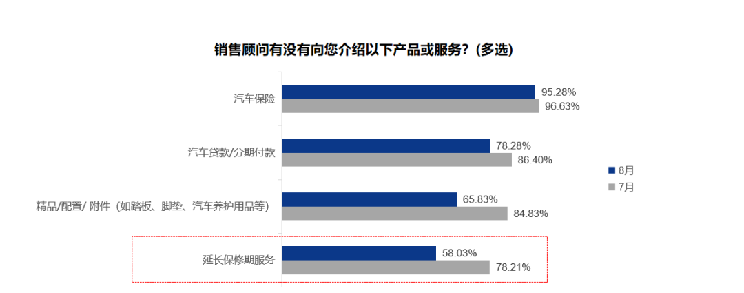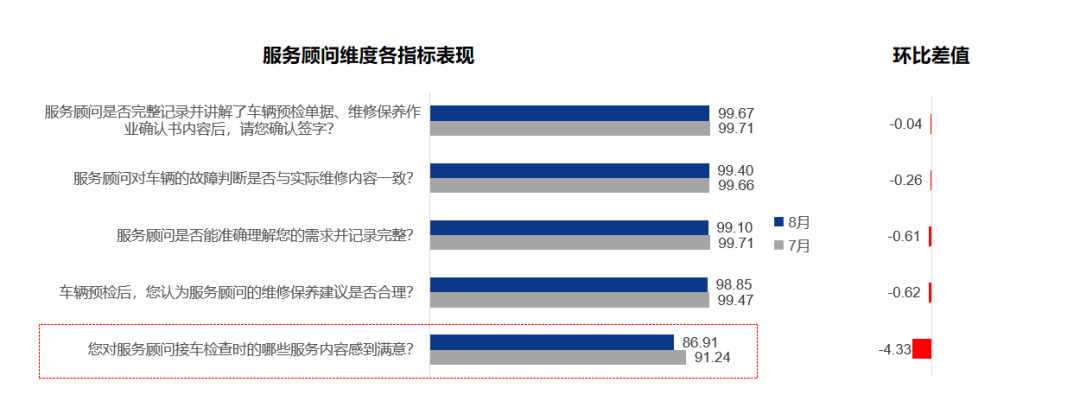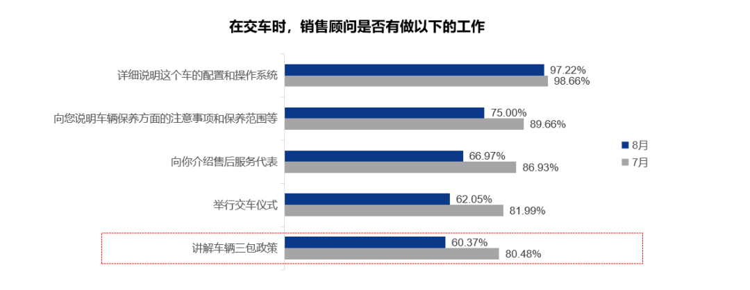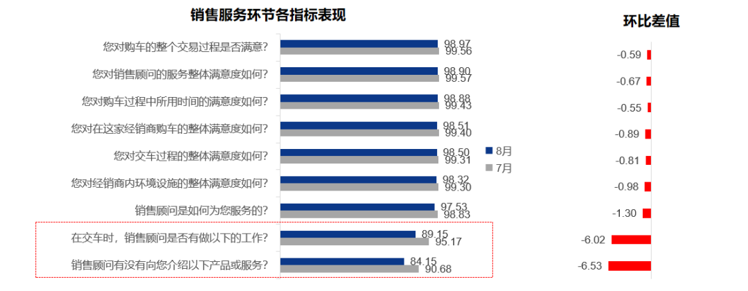 本月汽车销售服务口碑指数为 94.04 分,环比下降 3.02 分。消费者评价样本来自于 95 个城市中的 227 家汽车经销商,共计 2987 个样本,覆盖了 59 个汽车品牌。本月参与评价的经销商数量环比上月提升较多,也是本月销售服务口碑指数的下降的主要原因。持续使用 CADA 云数聚的汽车经销商会实时掌握到店消费者的服务评价,利于贴合消费者需求改进服务质量。