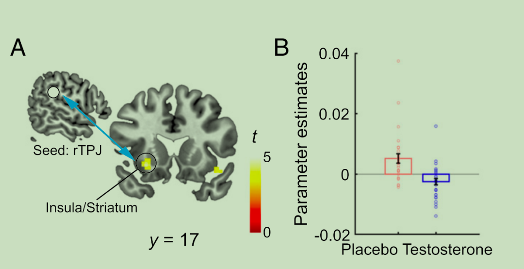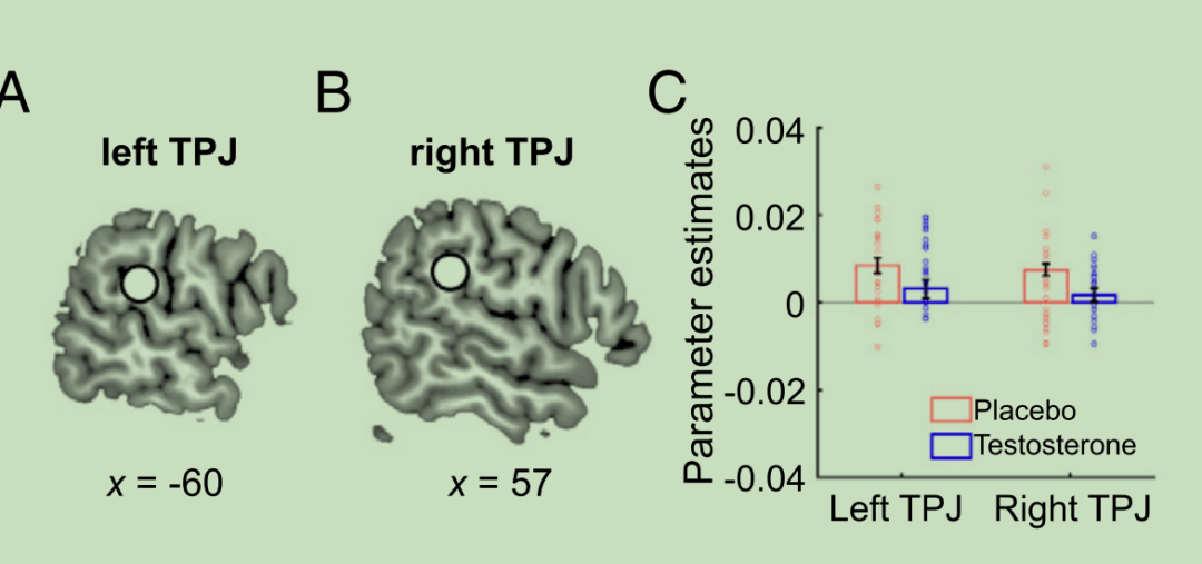 接下来,研究员探索这种现象后面的神经学机制,他们发现了睾丸素组的参与者的大脑颞顶交界处(TPJ)的活动与安慰剂组存在差异。