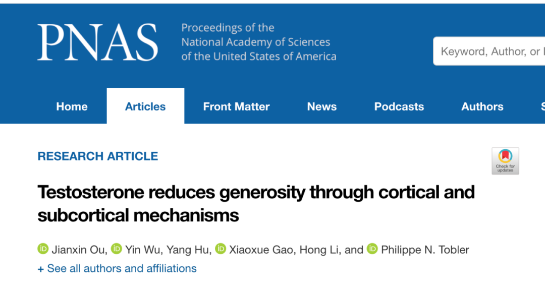 2021 年 3 月 23 日,由深圳大学,四川师范大学,上海体育大学等多单位合作发表在《美国国家科学院院刊》的一项研究再次验证了睾丸素会降低人的慷慨程度。研究发现,对于不是很亲近的人,睾丸素诱发了更多的自私选择,会让人更小气。