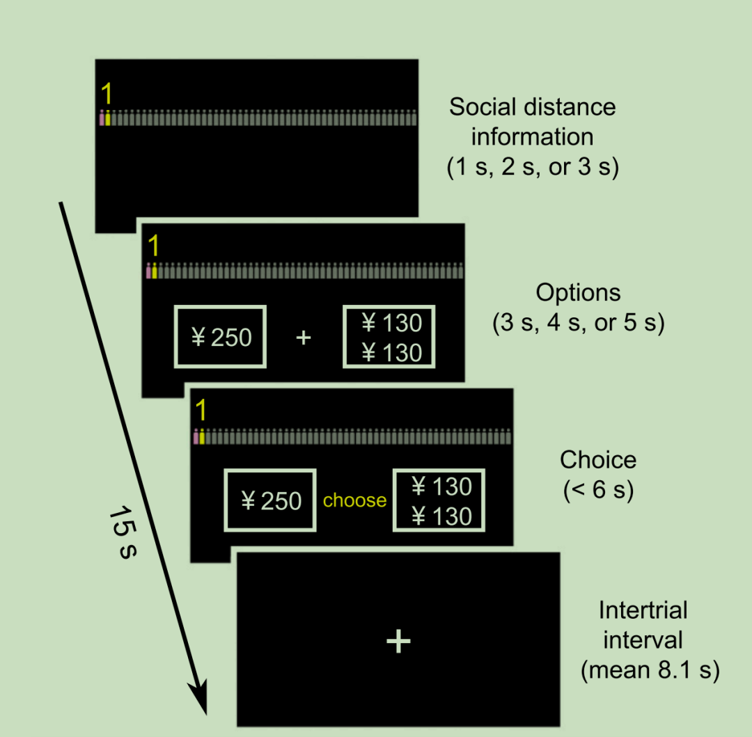 接下来,参与者被要求写下对应社会距离分别为 1、2、3、5、10、20 的对象者信息和参与者的关系,以及用于支付金钱的联系信息。此外,试验中还加了社会距离 50 和 100 的人(分别指纯粹的熟人和完全的陌生人)。