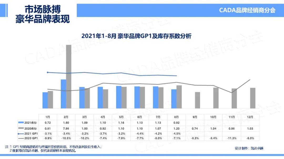 2021 年 8 月,豪华车市场 GP1 保持稳重有降,库存相比 7 月有明显降低。在本月的市场分析中,豪华品牌库存、GP1 表现与行业其他品牌系表现的差距在缩小。