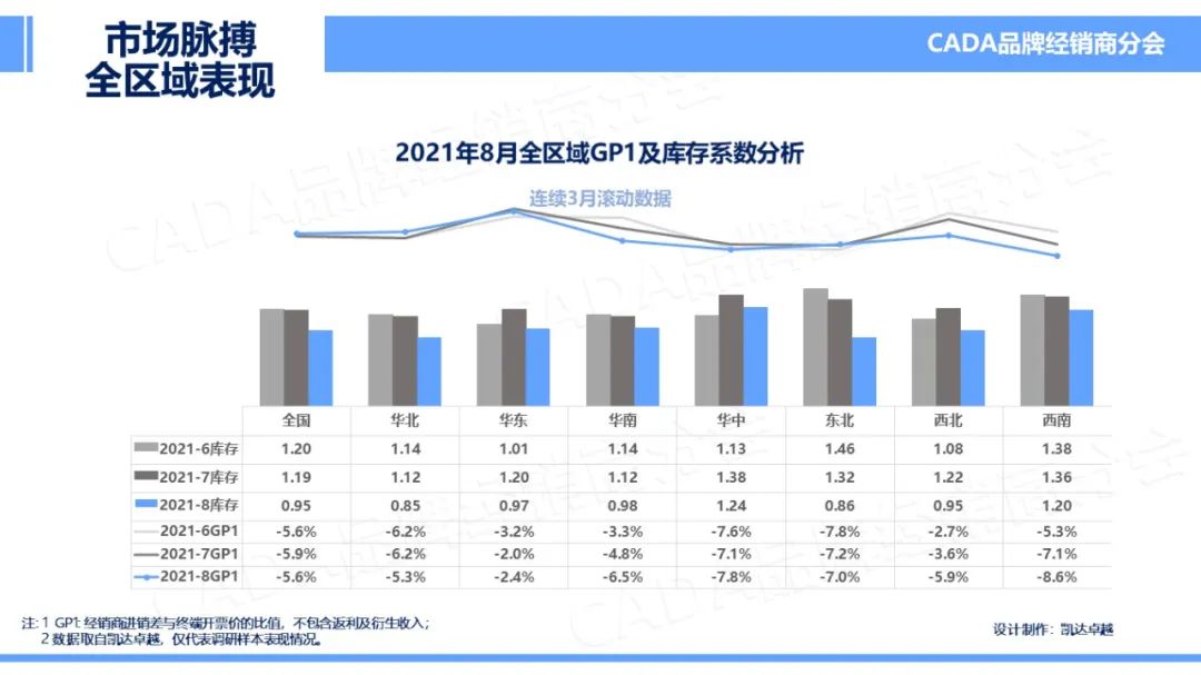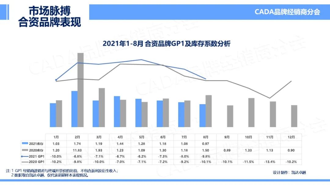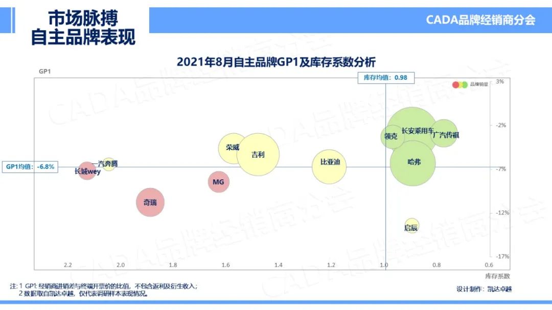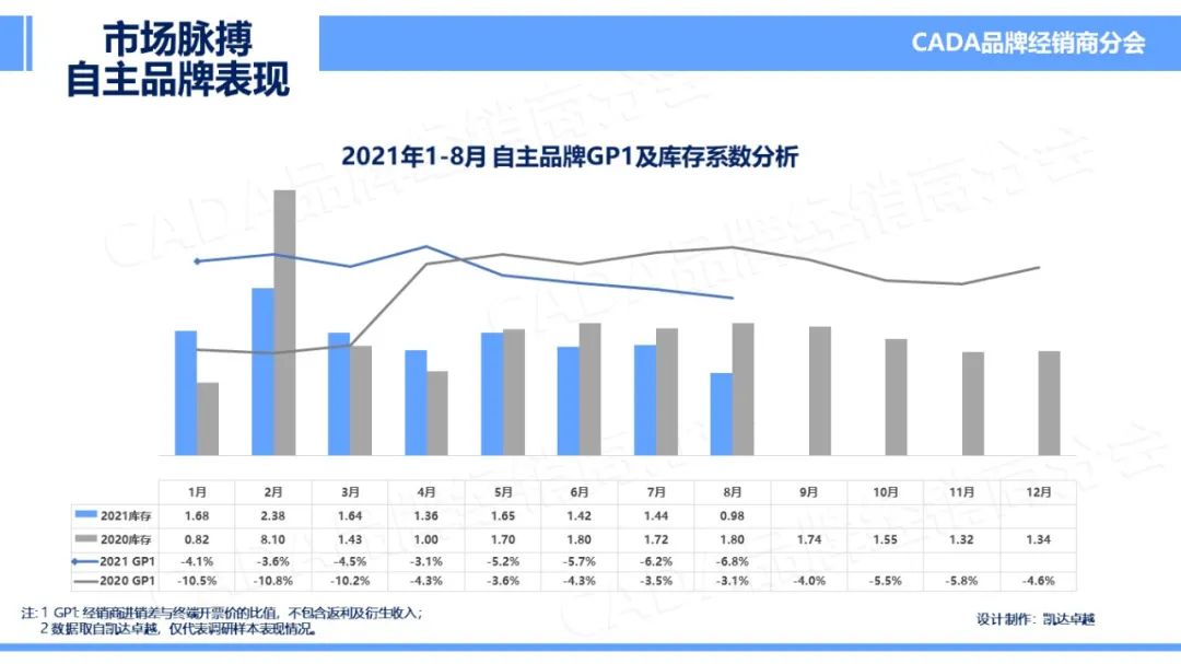 在 2021 年 8 月的表现中,自主品牌库存系数与行业持平,均有所降低。GP1 仍持续下探,微有降低,本月至 – 6.8%。