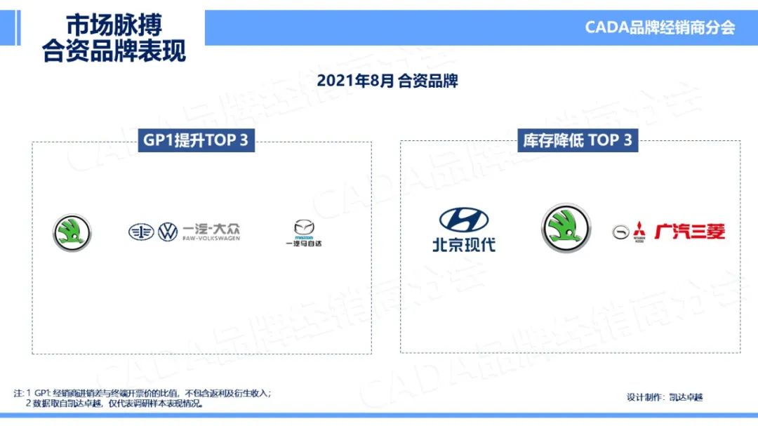 在本月非豪华合资品牌中,斯柯达、一汽大众、一汽马自达三个品牌成为 GP1 提升 TOP3;北京现代、斯柯达、广汽三菱品牌库存系数本月下降幅度最高。
