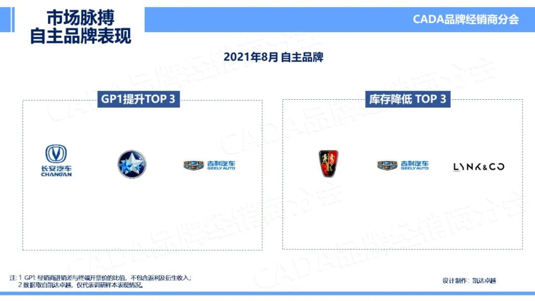 2021 年 8 月, GP1 提升最优的三个品牌为:长安、启辰、吉利;库存降低 Top3 为:荣威、吉利、领克。
