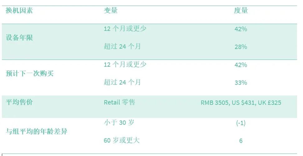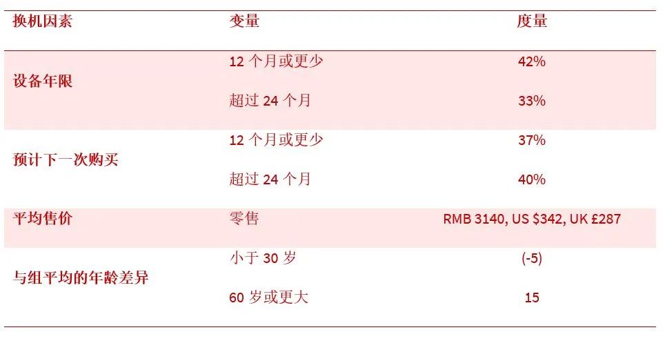 该指标的定义如下:更换周期 =当前设备的平均拥有时间 +预计购买更换设备的时间美国–平均换机周期为41个月