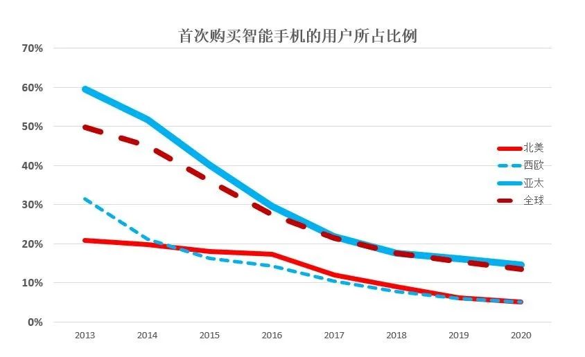 产品的采用并不是问题。智能手机随着价格的降低和服务覆盖范围的扩大而不断增长,全球市场已经相当成熟。厂商的市场表现取决于是否能够成为用户换机时的选择。目前,成熟市场售出的智能手机中,首次购机用户所占比例不到 5%,全球范围内不到 13%。