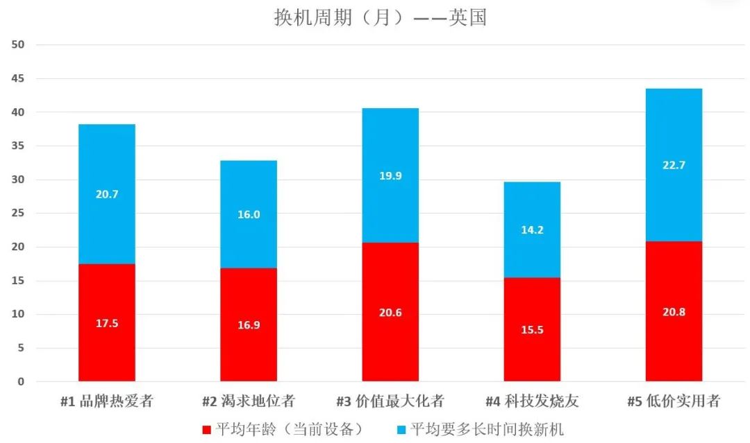 可进行营销操作的细分市场的一个标志是,当做分析时,这些群体显示出关键行为的显著差异。这项研究的关键行为是智能手机的更换周期。在下面的图表中,对研究涉及的三个国家的不同细分群的换机周期进行了分析。