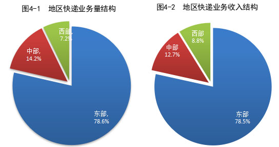 1-7 月,东、中、西部地区快递业务量比重分别为 78.6%、14.2% 和 7.2%,业务收入比重分别为 78.5%、12.7% 和 8.8%。与去年同期相比,东部地区快递业务量比重下降 1.4 个百分点,快递业务收入比重下降 1.5 个百分点;中部地区快递业务量比重上升 1.5 个百分点,快递业务收入比重上升 1.2 个百分点;西部地区快递业务量比重下降 0.1 个百分点,快递业务收入比重上升 0.3 个百分点。