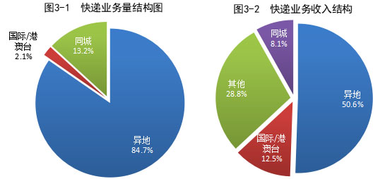1-7 月,同城、异地、国际 / 港澳台快递业务量分别占全部快递业务量的 13.2%、84.7% 和 2.1%;业务收入分别占全部快递收入的 8.1%、50.6% 和 12.5%。与去年同期相比,同城快递业务量的比重下降 3.1 个百分点,异地快递业务量的比重上升 3.3 个百分点,国际 / 港澳台业务量的比重下降 0.2 个百分点。