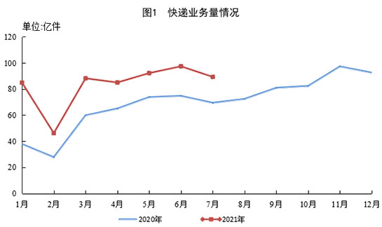 7 月份,全国快递服务企业业务量完成 89.3 亿件,同比增长 28.8%;业务收入完成 827.2 亿元,同比增长 14.4%。