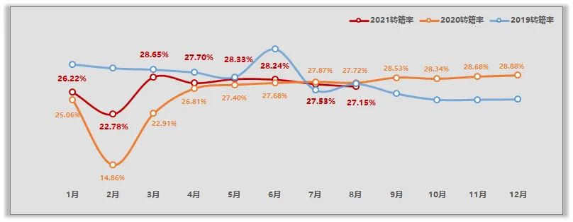 8 月二手车转籍比例为 27.15%,转籍比例较去年同期下降了 0.57 个百分点。环比上月下降了 0.38 百分点。