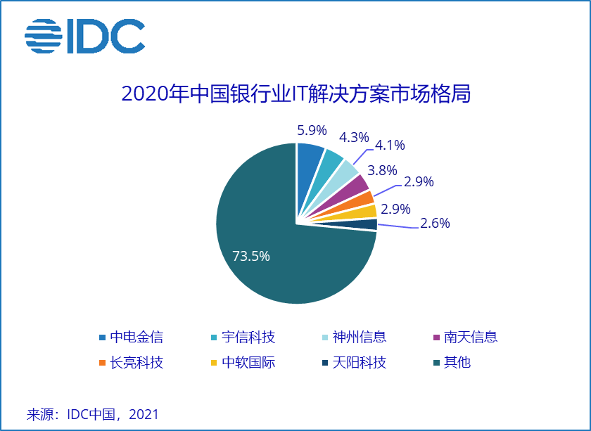 2020年中国银行业IT解决方案市场的整体规模达到502.4亿元人民币,比2019年增长18.0%。IDC预测该市场2021年到2025年的年均复合增长率为14.64%。IDC预测,到2025年,中国银行业IT解决方案市场规模将达到1,185.6亿元人民币。从竞争格局看,中电金信、宇信科技、神州信息等厂商仍保持领先地位。