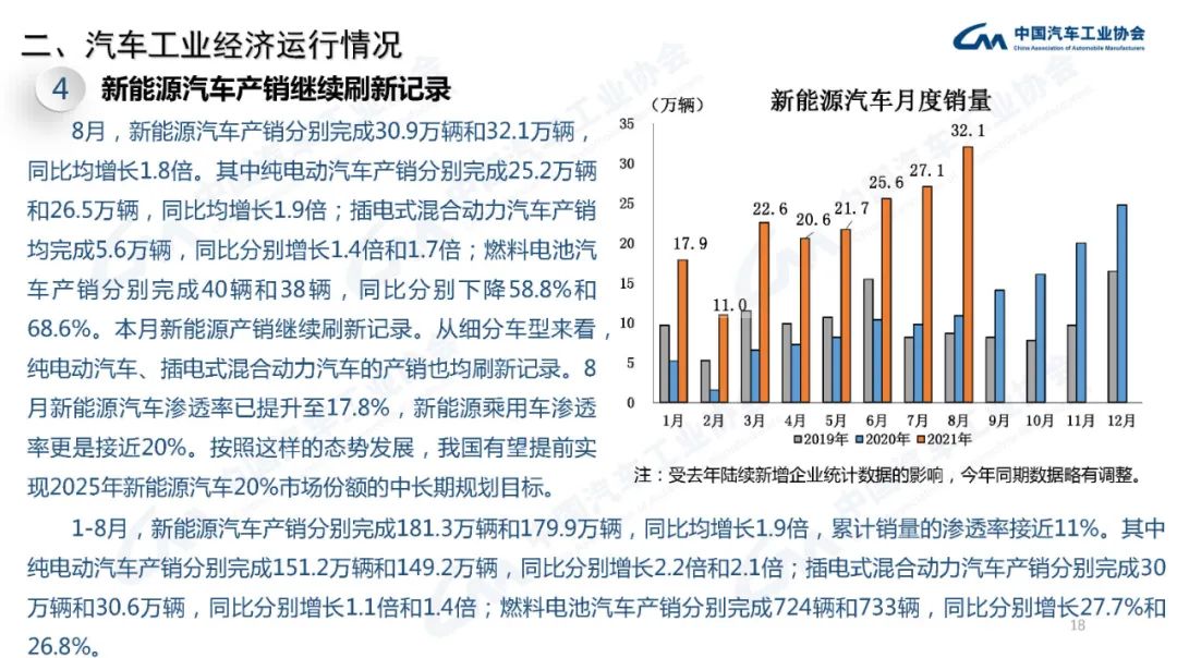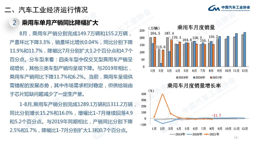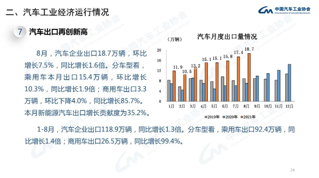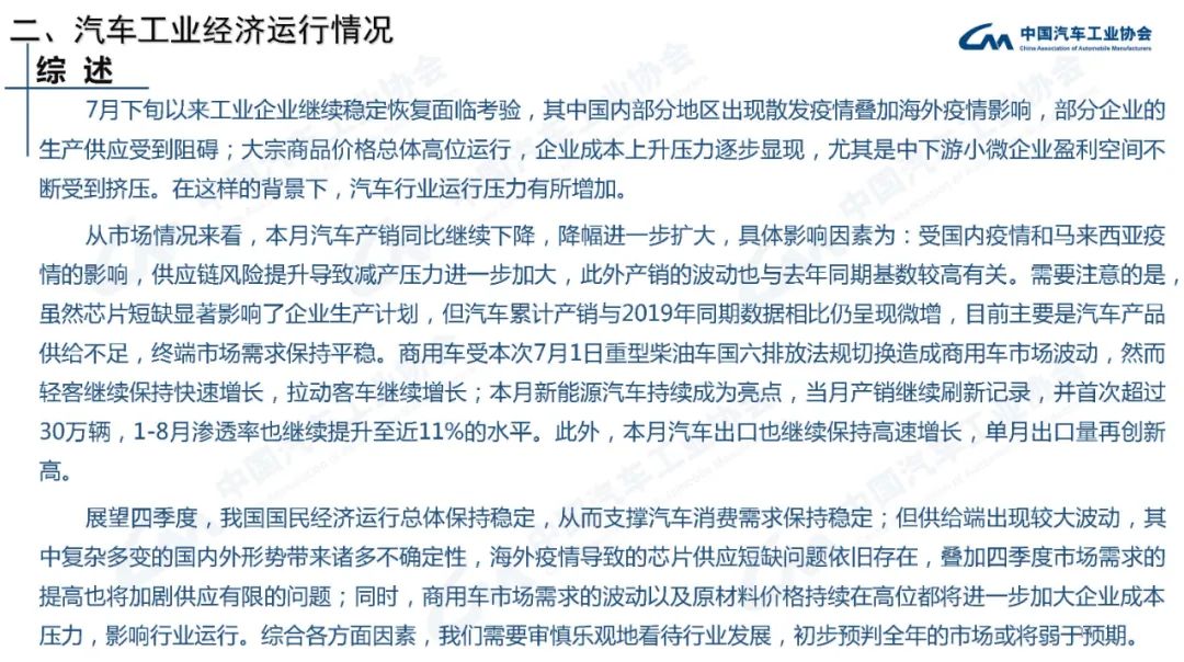 据中国汽车工业协会统计分析,本月汽车产销同比继续下降,降幅进一步扩大。受国内疫情和马来西亚疫情的影响,供应链风险提升导致减产压力进一步加大,此外产销的波动也与去年同期基数较高有关。需要注意的是,虽然芯片短缺显著影响了企业生产计划,但汽车累计产销与2019年同期数据相比仍呈现微增,目前主要是汽车产品供给不足,终端市场需求保持平稳。商用车受本次7月1日重型柴油车国六排放法规切换造成商用车市场波动,然而轻客继续保持快速增长,拉动客车继续增长;本月新能源汽车持续成为亮点,当月产销继续刷新记录,并首次超过30万辆,1-8月渗透率也继续提升至近11%的水平。此外,本月汽车出口也继续保持高速增长,单月出口量再创新高。