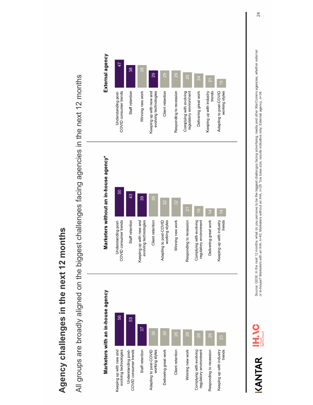 那些没有内部营销机构的受访者将“设置成本”列为他们面临的首要挑战。拥有内部机构的营销人员则将其放在挑战列表的底部。