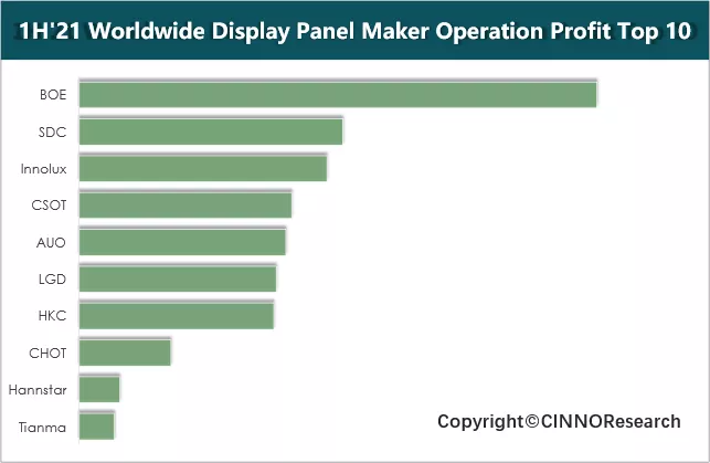 在全球面板厂的营业利润方面,根据CINNOResearch统计数据显示,2021年上半年全球面板企业总营业利润超出110亿美元,创历史新高,全球仅四家面板厂营业亏损。按各面板厂营业利润排名来看,京东方BOE 以绝对优势超越三星显示SDC位列全球第一,占全球面板厂营业利润的26%;群创Innolux 紧跟三星显示SDC其后排名第三;TCL华星CSOT 则排名第四;友达AUO、乐金显示LGD、惠科HKC 分列第五、第六和第七名;咸阳彩虹CHOT、翰宇彩晶Hannstar和天马Tianma则分列全球第八至第十名。