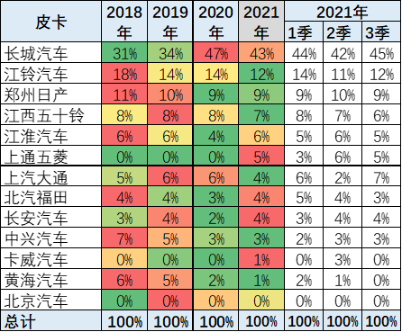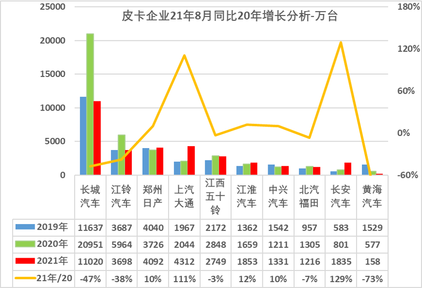 今年轻卡受到治理超载的刺激增量逐步进入尾声,虽然 2021 年 8 月的皮卡负增长,但相对于传统轻卡的表现还是很强的。