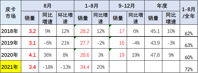 2021 年 8 月份皮卡市场销售 3.4 万辆,同比下降 18%,环比下降 13%。由于疫情后回暖较强导致今年 1-8 月同比增长 20% 的表现较强。