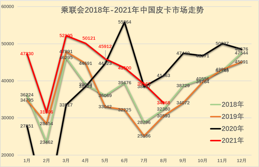 根据乘联会数据,2021 年 8 月份皮卡市场销售 3.4 万辆,同比下降 18%,环比下降 13%。因为疫情后回暖和市场新增长动力较强,导致今年 1-8 月同比增长 20% 表现较强,同时今年也是相对于 2019 年皮卡市场的强势增长。