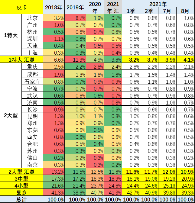 皮卡市场目前主要的销售区域还是在以中小城市和县乡市场为主,县乡市场以目前的表现来说还是相对较强的。今年 1-8 月的县乡市场表现尤其突出。而中型城市市场保持稳定,大城市市场目前来看并没有明显的突破特征。
