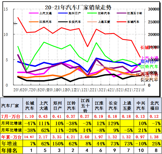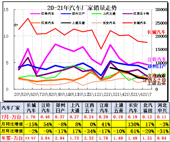 长城汽车 2021 年的 8 月厂商销量 11020 辆,同比增长 – 47.4%,缺芯影响较大。主力厂商长城汽车的表现优于行业走势,长城汽车皮卡技术储备较强,提早准备国六调整,实现了较好的产品对应,长城汽车在 2020 年四季度的销量小幅收缩。2021 年初表现较强。
