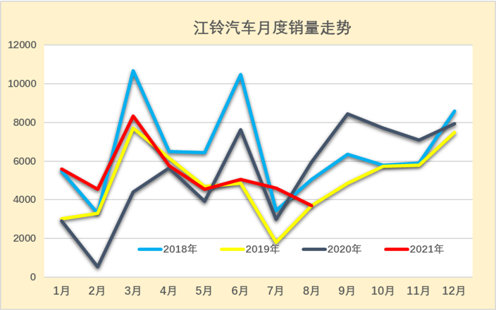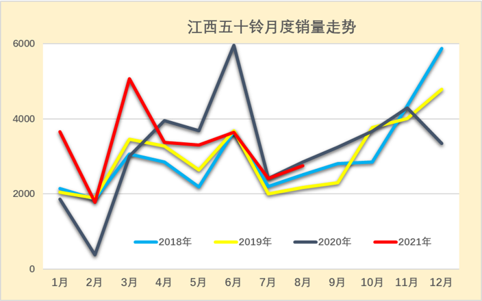 江西五十铃皮卡市场 2021 年 8 月厂商销量 2749 辆,同比增长 – 3%,表现较强。
