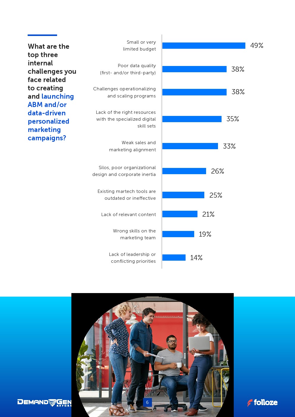 尽管在整个生命周期中推动增长是理想的,但内部障碍可能会阻碍增长。在创建和执行ABM或数据驱动的个性化活动时,受访者面临的最大挑战是预算少或有限(49%)。其他人在实施和扩展项目方面面临挑战(38%),缺乏具备专业技能的适当资源(35%)。