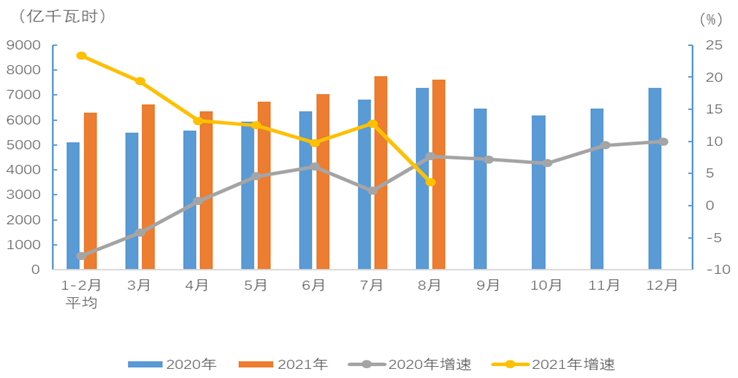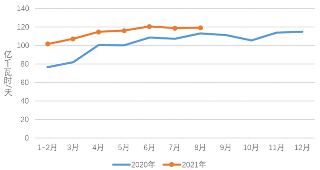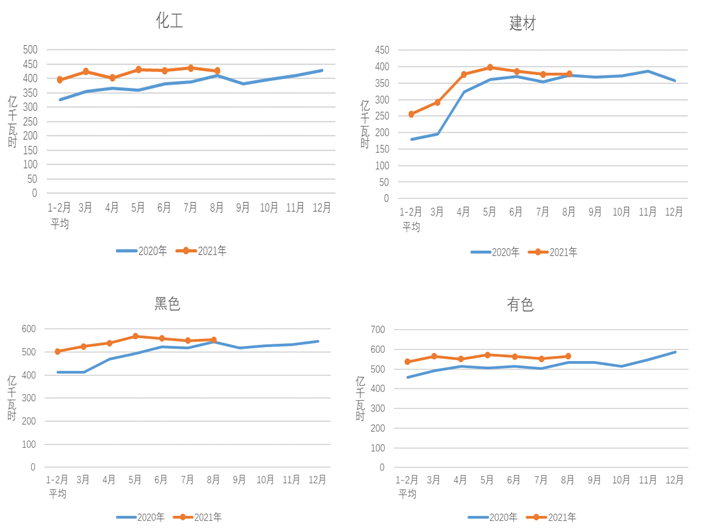 1-8月,化工行业用电量3338亿千瓦时,同比增长9.9%,增速比上年同期提高11.2个百分点;建材行业用电量2721亿千瓦时,同比增长14.5%,增速比上年同期提高14.9个百分点;黑色金属冶炼行业用电量4302亿千瓦时,同比增长12.6%,增速比上年同期提高11.3个百分点;有色金属冶炼行业用电量4446亿千瓦时,同比增长8.2%,增速比上年同期提高5.4个百分点。