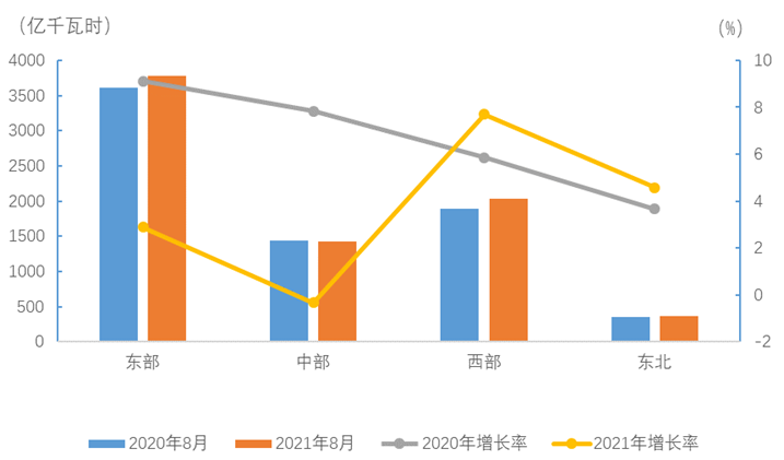 8月份,东、中、西部和东北地区全社会用电量增速分别为2.9%、-0.3%、7.7%和4.6%。
