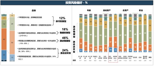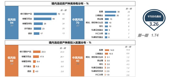 除境外不动产投资比例大幅下降外,富裕家庭资产配置比例与上期基本一致;但投资组合风险偏好有所上升。境内高风险资产(尤其是公募基金、私募基金)配置比例明显上升,在银行理财比例基本不变的前提下,更多现金和储蓄转化为风险资产;境外也类似,投资境外股票、私募基金和境外衍生品的比例明显上升,成为不动产投资的替代。