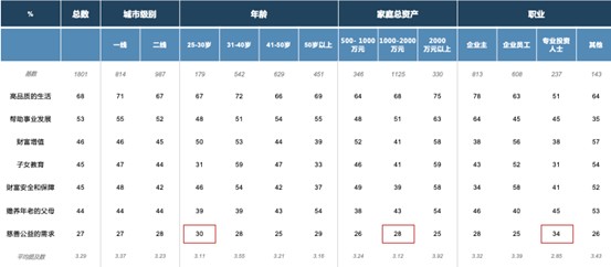 除“财富安全保障”外,所有财富规划目标选择比例均比上期有所增加。在国家共同富裕方针的感召下,整体的公益慈善意识有所提升;25-30岁年轻人群对公益慈善的热情高于其他年龄层;总资产1000-2000万、人数最多比例的家庭对慈善的需求相对更高;投资人士的公益热情也要高于其他职业。