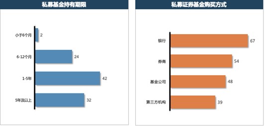 在私募证券基金方面,其持有期限主要集中在1-5年。这表现出富裕家庭对私募基金大多采用长期投资的策略。购买方式主要仍以银行渠道为主,券商次之。银行作为金融机构的主体仍是富裕家庭最信赖的平台。