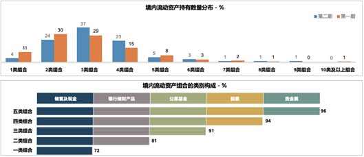 境内流动资产组合中,37%的投资组合中包含公募基金,23%投资组合中包含股票。投资组合中构成最多的是银行理财、公募基金和股票,同时持有现金/银行理财/公募基金的人数最多,单纯持有现金的家庭比例极小。