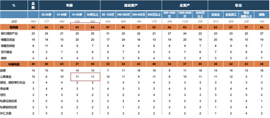 中高风险资产配置比例和流动资产规模和家庭总资产规模都成正比。从境内流动资产配置比例来看,50岁以上人群虽低风险资产比例最高,但公募基金配置比例也最高。